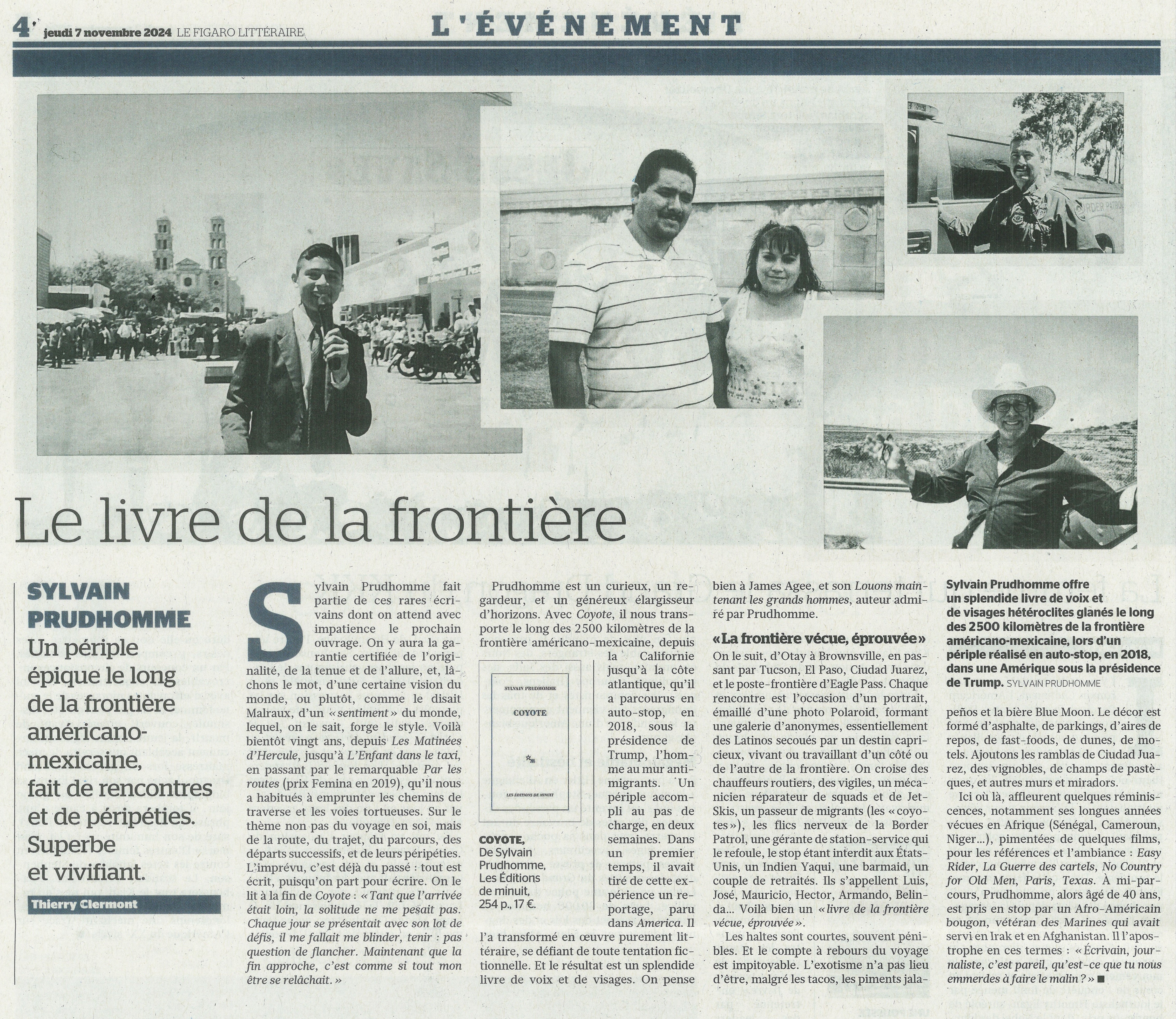 Deux semaines pour faire 2.500 kilomètres, l’essentiel en auto-stop, le long de la frontière mexicaine de la Californie au golfe du Mexique : un sujet de reportage (pour la revue America) sur lequel Sylvain Prudhomme s’était lancé comme il se lance souvent dans ses romans : sans filet. Coyote, ce sont les chutes accumulées pendant deux semaines, les propos recueillis d’un véhicule à un autre.