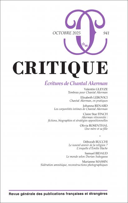 Dix ans après sa disparition, Chantal Akerman reste plus que jamais notre contemporaine. Tandis que ses films et installations font l’objet de nombreuses rétrospectives et expositions, s'imposent également ce que ce numéro de Critique, coordonné par Valentin Gleyze, propose de nommer les « écritures » de Chantal Akerman.