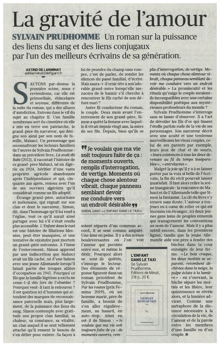 Cet Enfant dans le taxi, c'est le très attendu nouveau roman (et le premier à l'enseigne des éditions de Minuit) de Sylvain Prudhomme, prix Femina 2019 avec Par les routes (Gallimard). Passons d'emblée à ce qui n'est pas une hyperbole : c'est splendide. Une sorte de mélo intimiste, douloureux et tendre où l'auteur promène toujours son récit à la seule hauteur de ses personnages. il faut y voir là, comme dans tous les livres précédents, une morale d'écriture à égale distance entre un naturalisme sec et les plaisirs solitaires de l'autofiction. Chez Prudhomme, ce qui domine, mais ne surplombe pas donc, c'est le mouvement. C'est par le mouvement que Simon, son alter ego, renoue les liens défaits, chasse le spectre de la tristesse. Il règne sur tout cela également, puisque comme chez Jean Renoir "tout le monde a ses raisons", un bel humanisme, une attention scrupuleuse portée aux riens de la vie. Enfin, Prudhomme est en ces pages plus que jamais le plus beau peintre de nos paysages, de nos territoires tant il est vrai que ses provinces, mêmes lointaines, sont d'abord celles du coeur. Le reste n'est rien, juste une affaire de solitudes déjouées. De toute beauté.