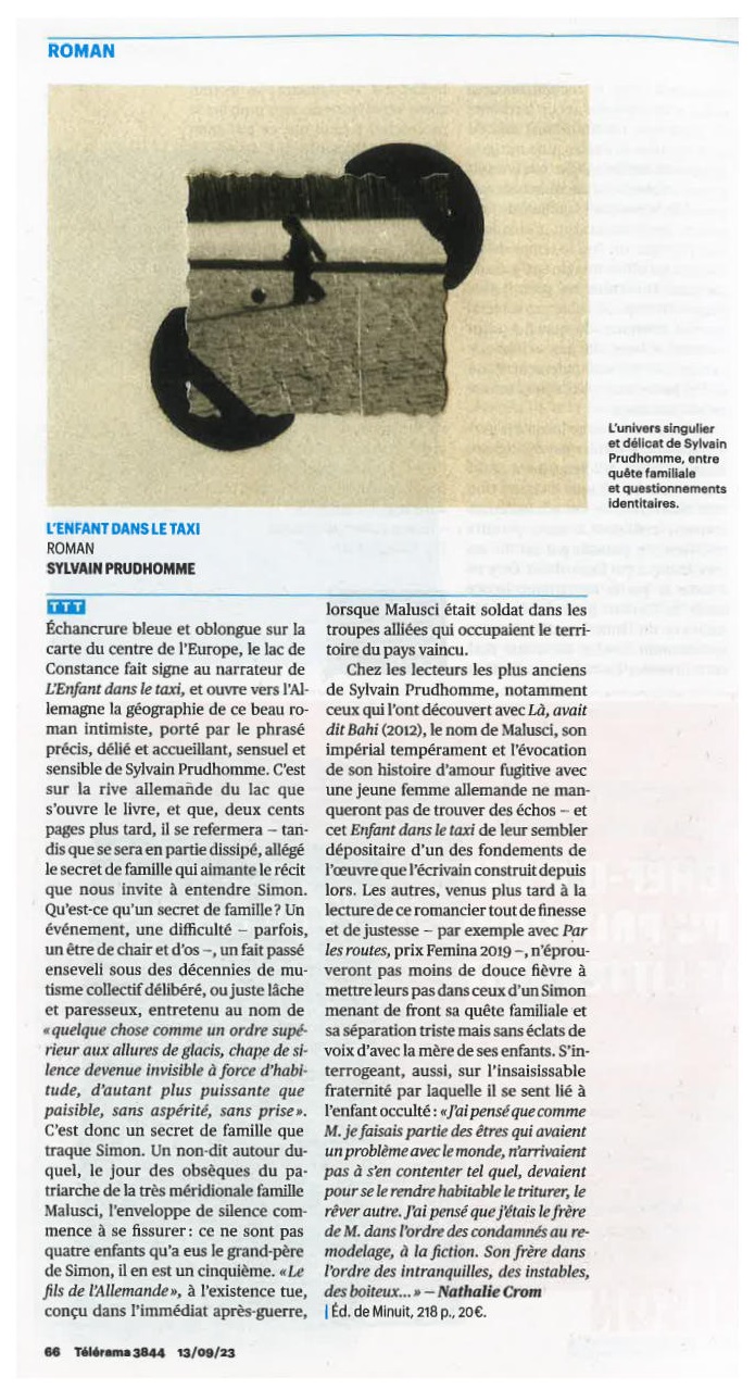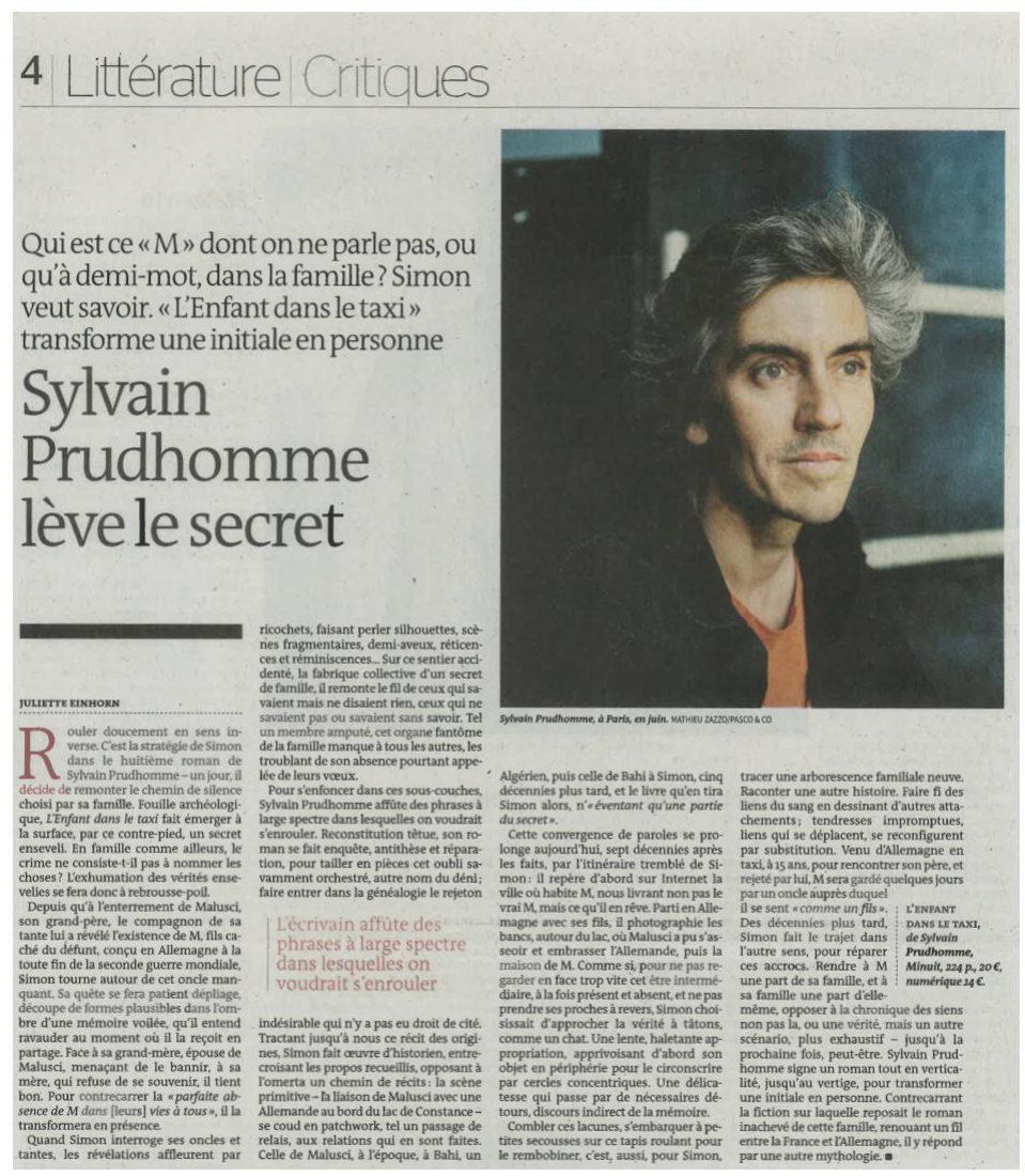 C'était une des leçons de "Par les routes", ce très beau roman qui n'avait pas la prétention d'en donner, et qui a valu le prix Femina 2019 à Sylvain Prudhomme : "Le monde se divise en deux catégories. Ceux qui partent. Et ceux qui restent." Ce pourrait être une des clés de "L'Enfant dans le taxi", qui démarre pour Simon par cette révélation lors d'un enterrement : "Tu es au courant n'est-ce pas que ton grand-père a eu un fils en Allemange à l'époque où il était soldat d'occupation au bord du lac de Constance." Simon, bien sûr, n'était pas au courant du tout, "puisque depuis toujours dans l'ordre des familles le crime c'est de parler, jamais de se taire". Il est tombé des nues. Il a voulu en savoir plus : sur le vieil amour de ce patriarche et d'une belle Allemande ; sur le fils qu'il a privé de père ; sur la loi du silence, ce ciment des tribus, qui a condamné l'inglorious bastard à n'être qu'une "erreur de jeunesse" ; sur les quelque "400 000 enfants allermands" qui, comme ce malheureux M., seraient "nés de soldats alliés" dans le sillage de la Seconde Guerre mondiale.