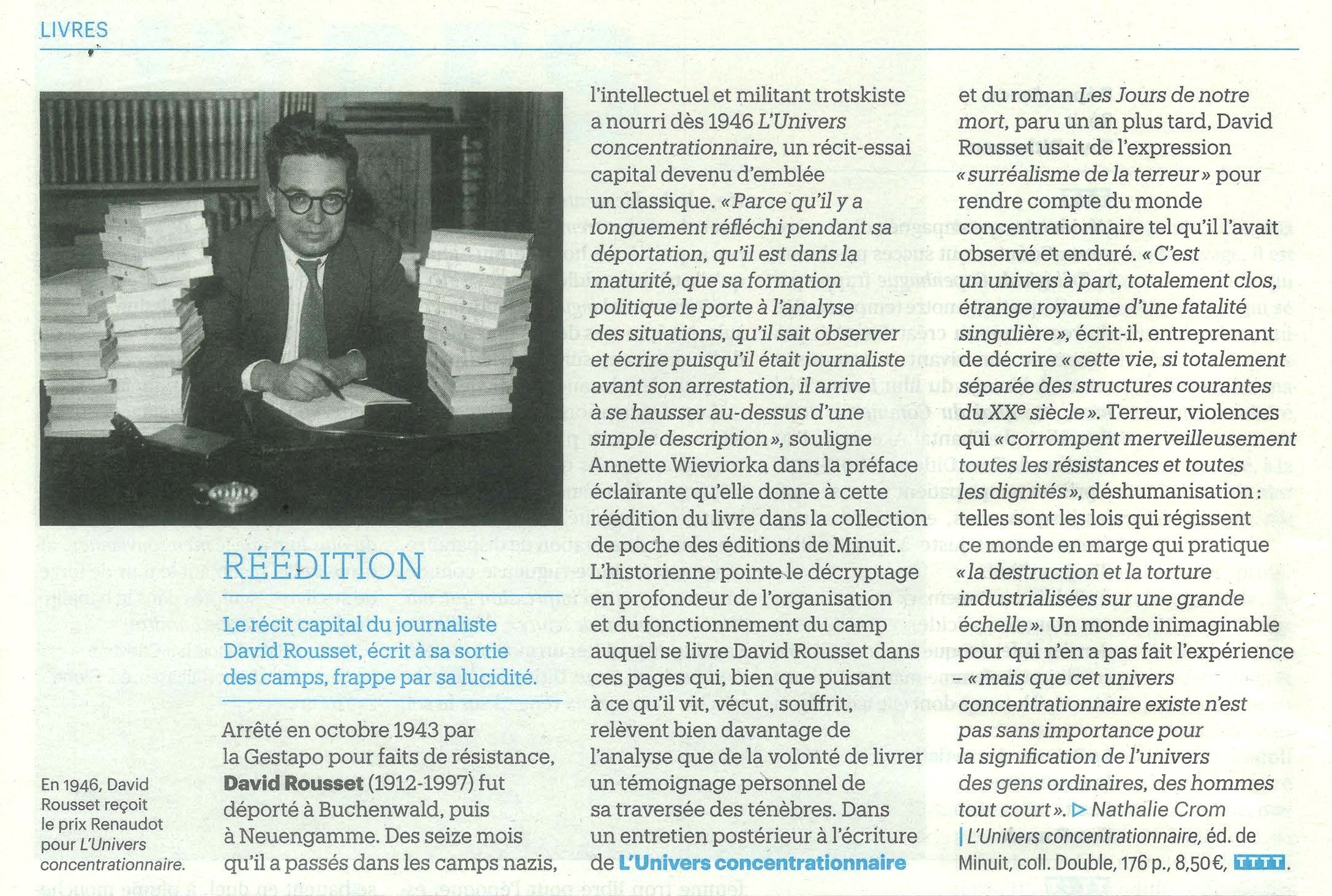 Résistant et déporté, David Rousset écrivit dès son retour L’Univers concentrationnaire. Publié en 1946, son livre reçoit le prix Renaudot. Cet ouvrage fondamental rejoint en 1965, comme Le Convoi du 24 janvier de Charlotte Delbo, le catalogue des Éditions de Minuit qui avaient publié La Nuit d’Elie Wiesel en 1958.